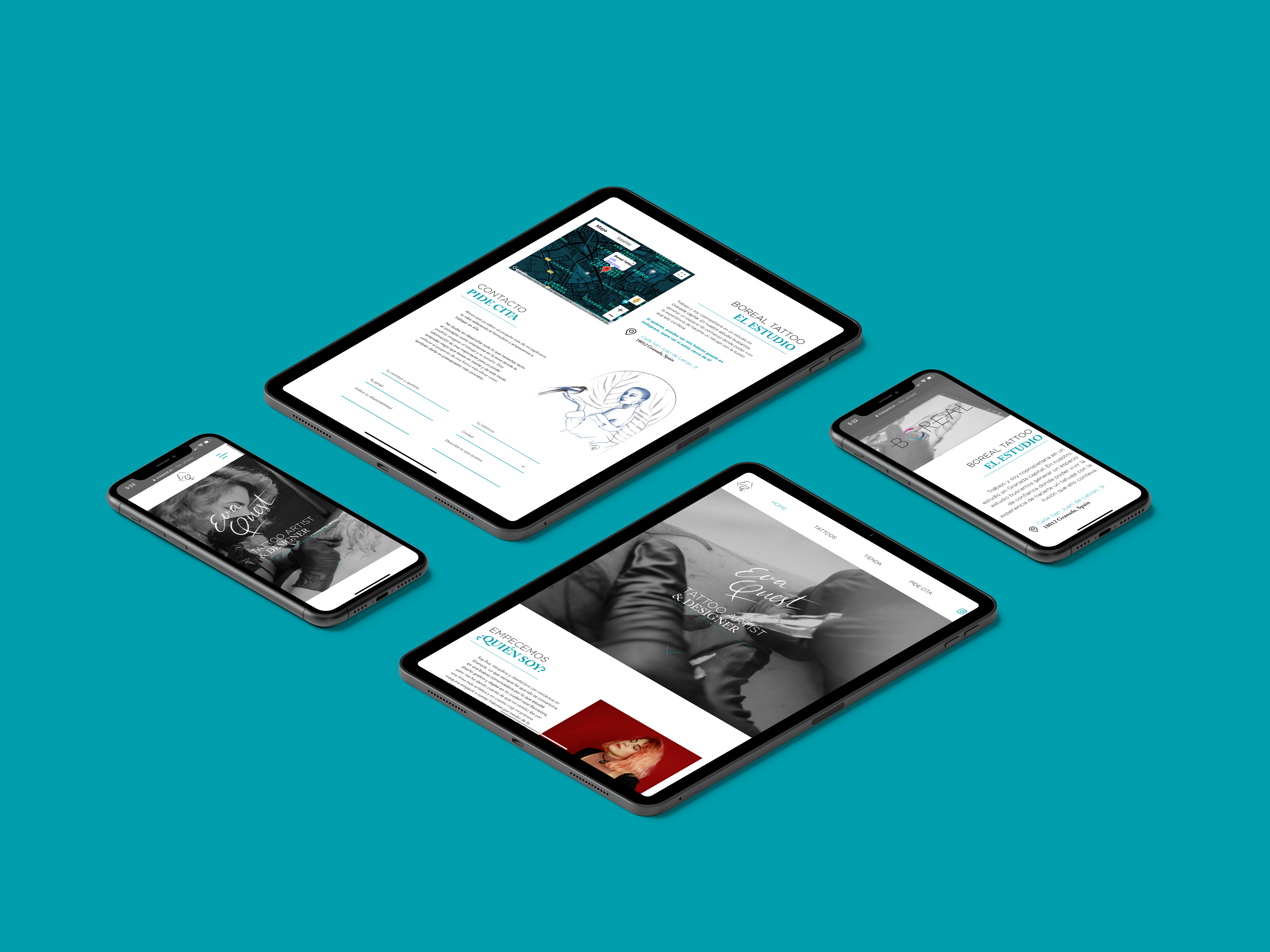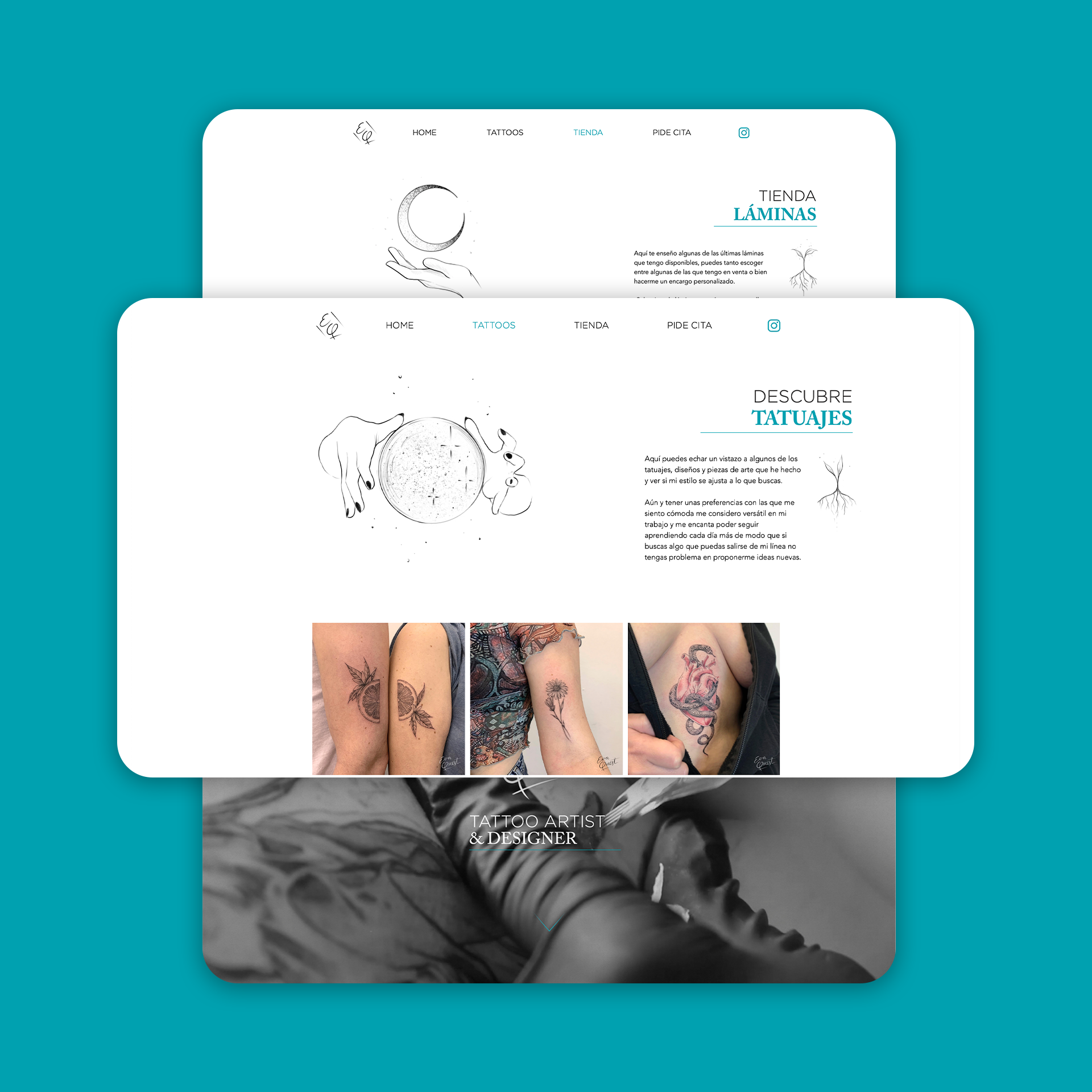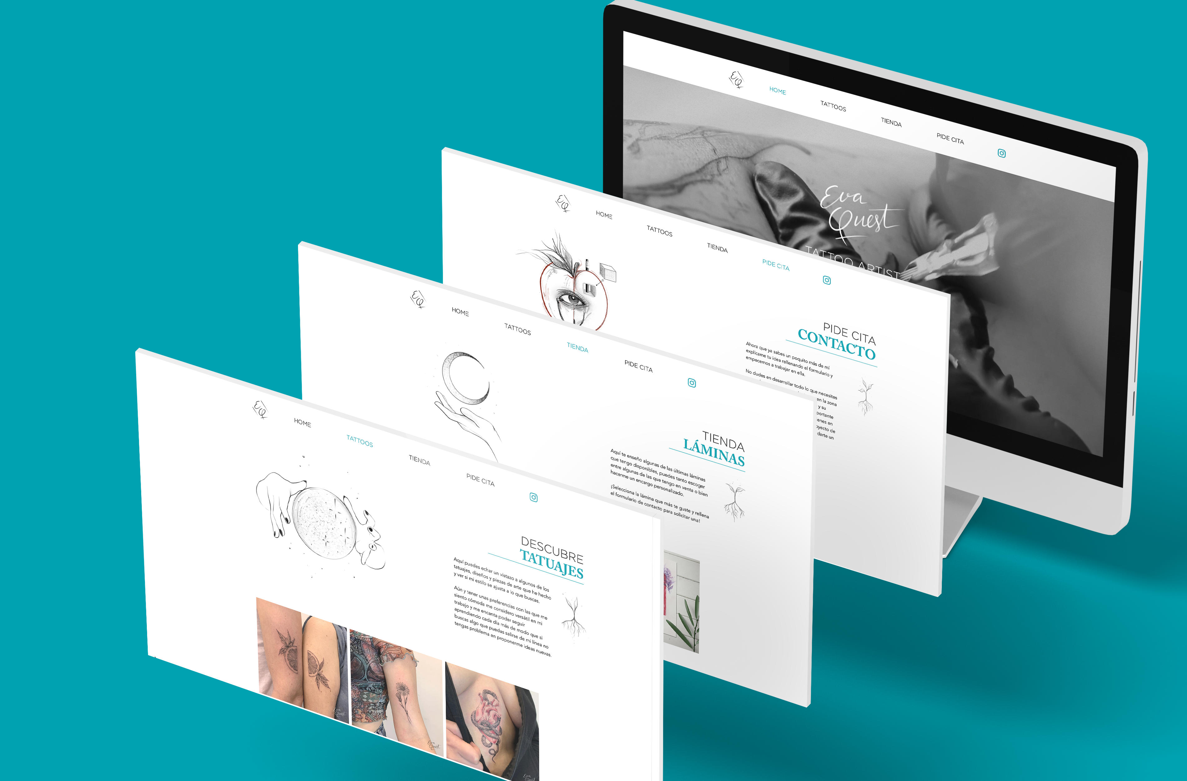 Diseño minimalista y fresco de una página web de portfolio profesional y tienda de láminas para la tatuadora Eva Quest, propietaria de Quest Tattoo Studio.