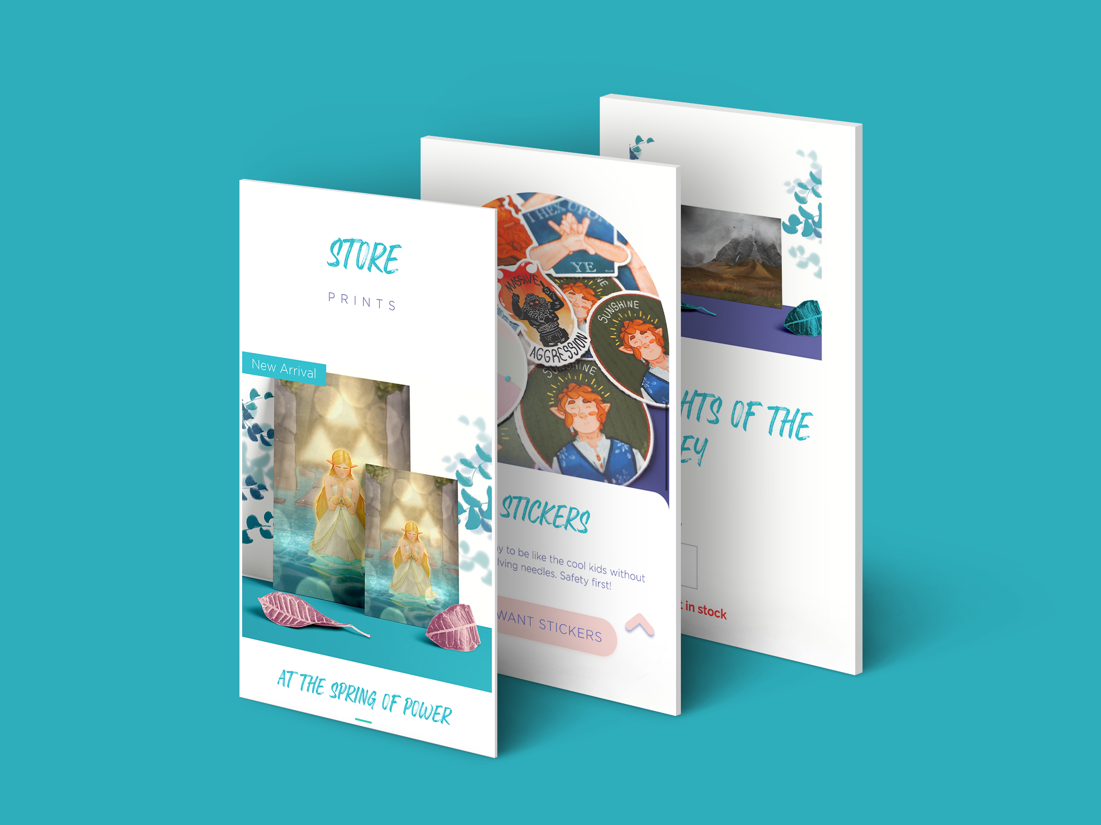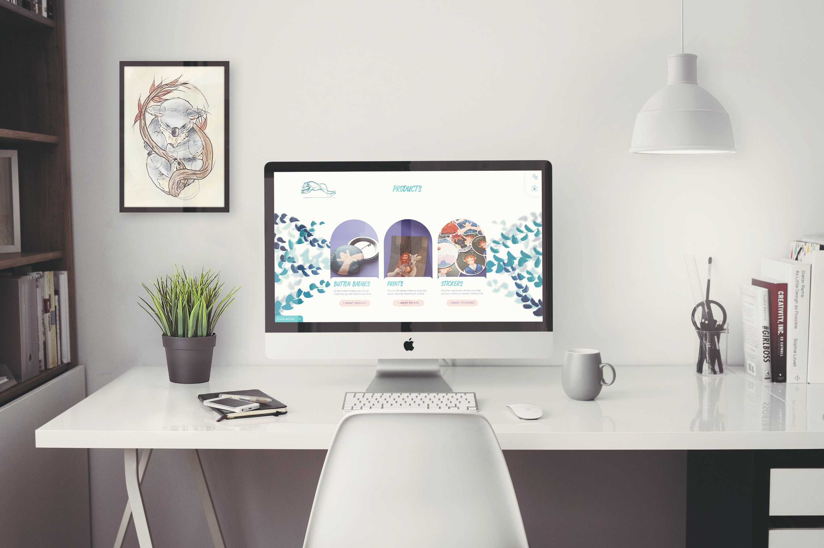 La página es una web sencilla con pasarela de pago segura, un formulario de contacto, y showcase de los productos que se venden en ella: chapas, láminas, pegatinas… El diseño y los colores corporativos pretenden transmitir frescura y asociarse con el fondo marino, algo que la artista siente que la representa. El logotipo está hecho mediante la firma que utiliza para sus piezas, y las animaciones que decoran las páginas son material de la propia artista.