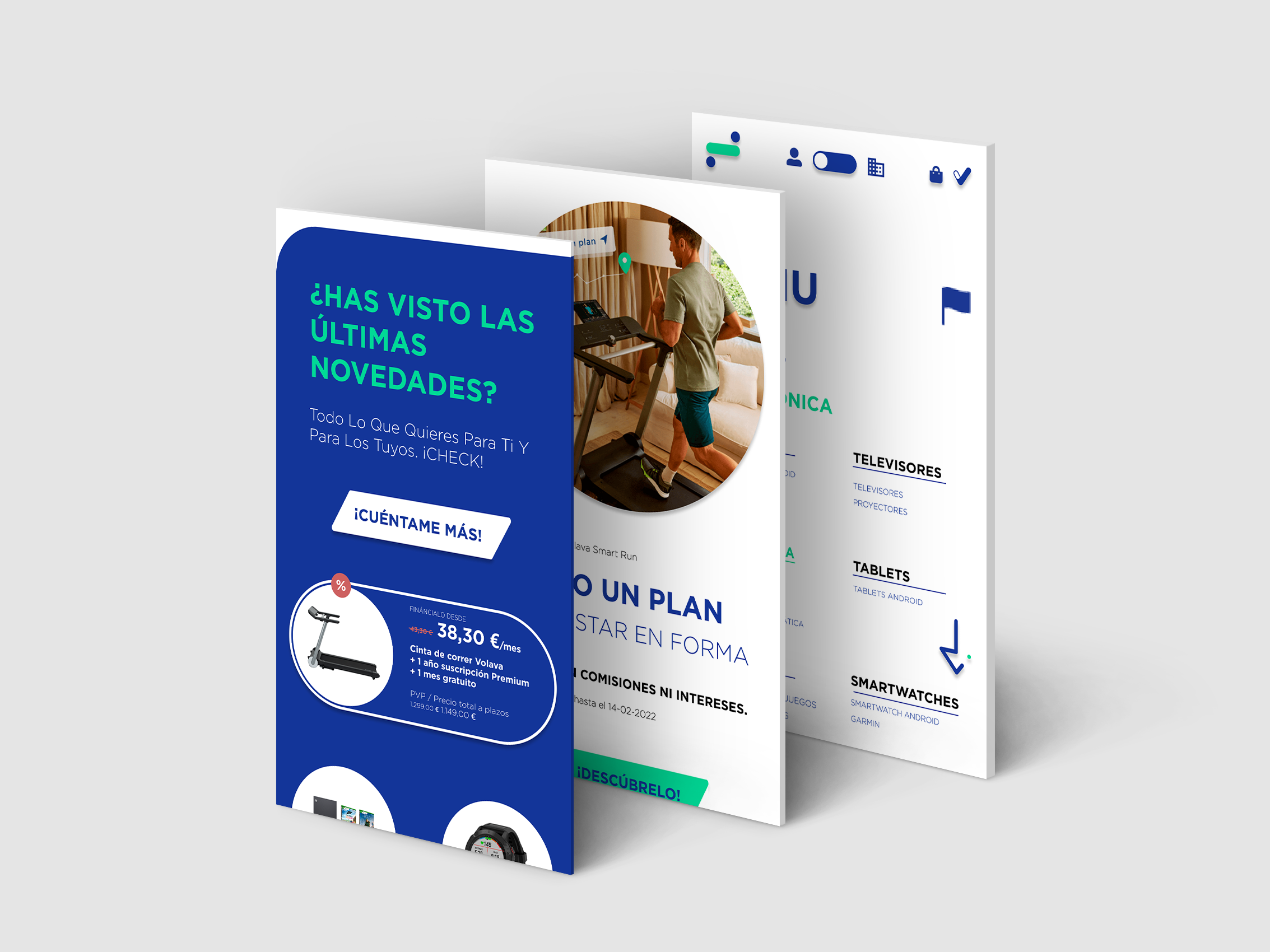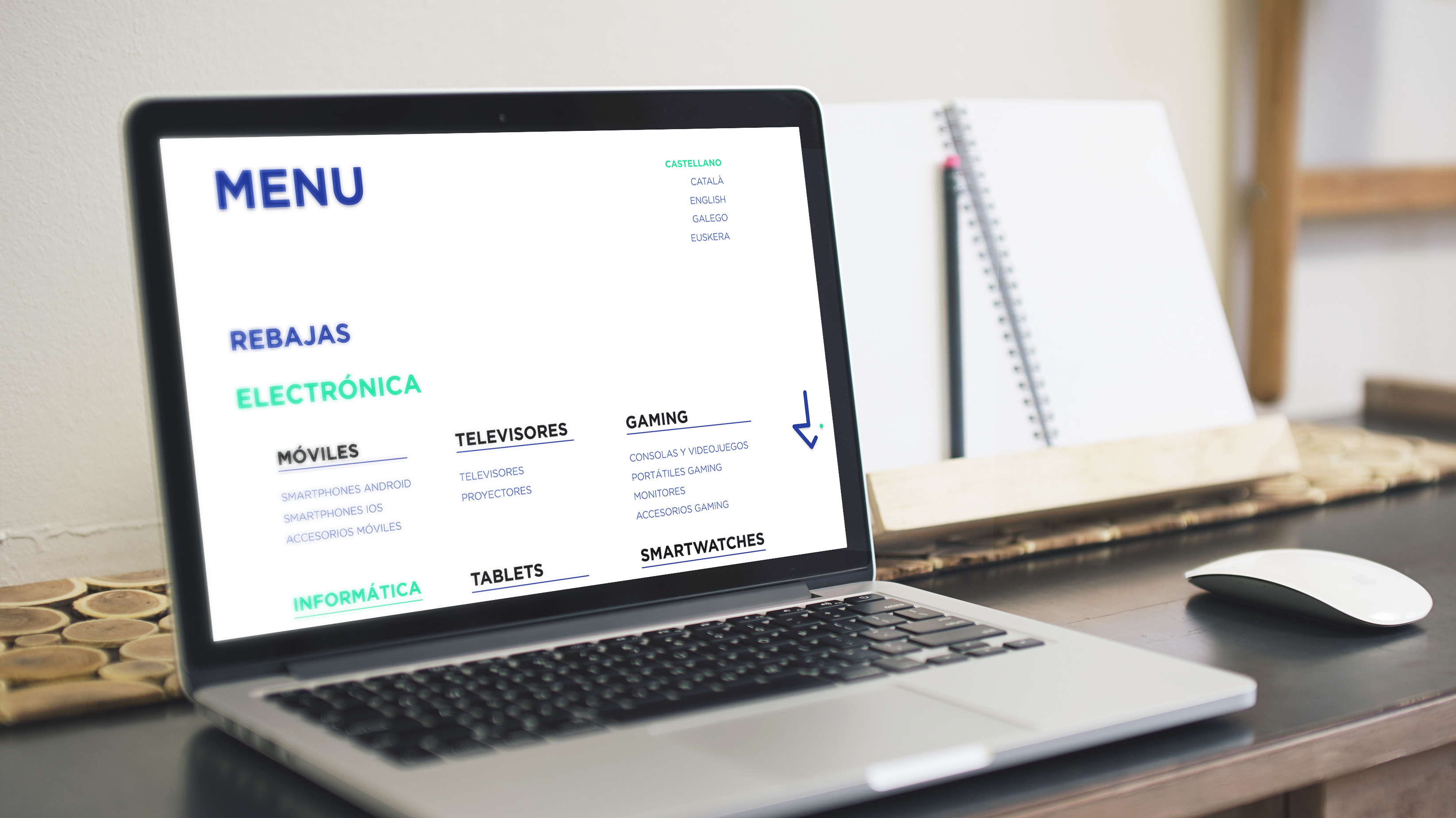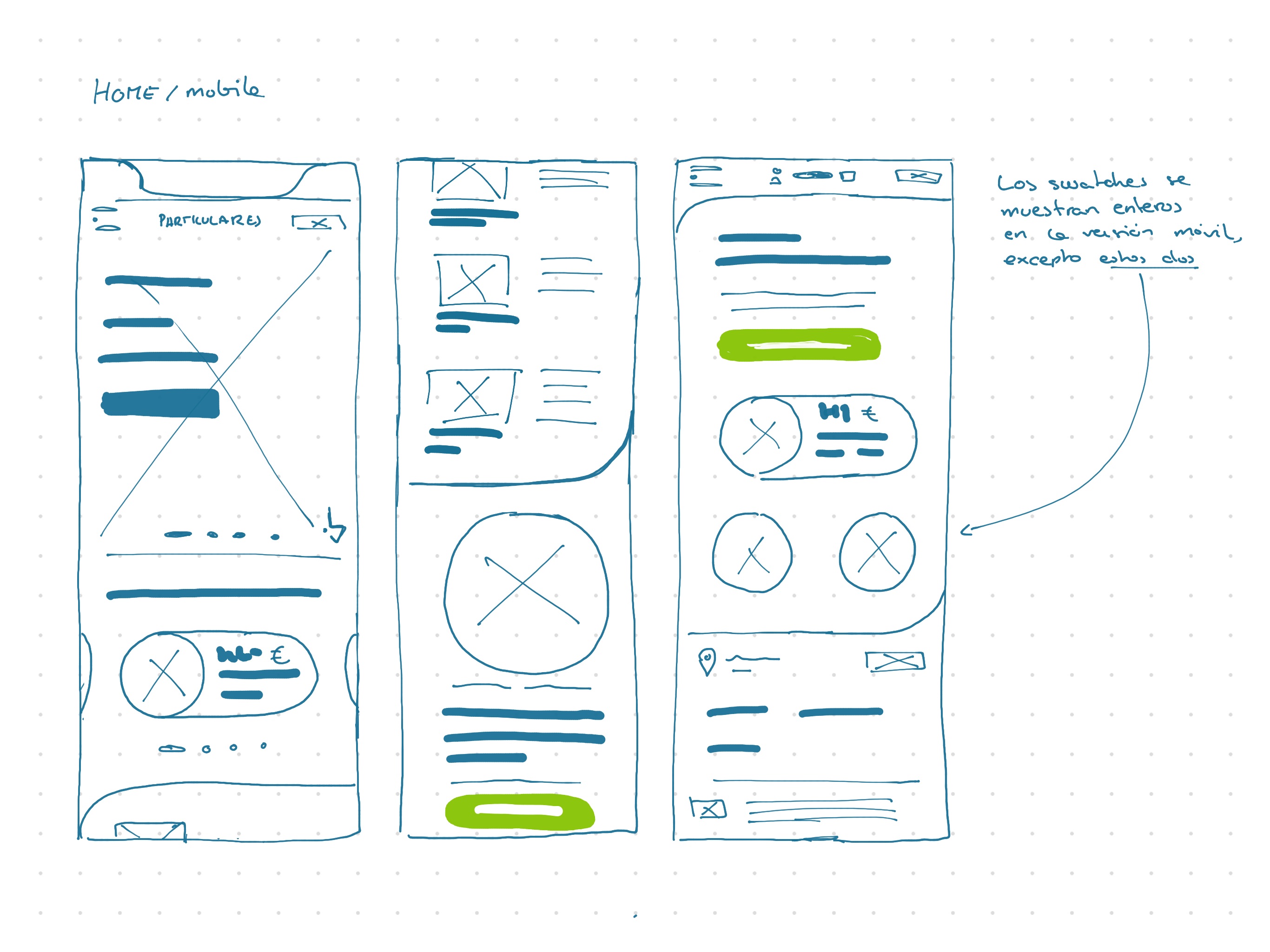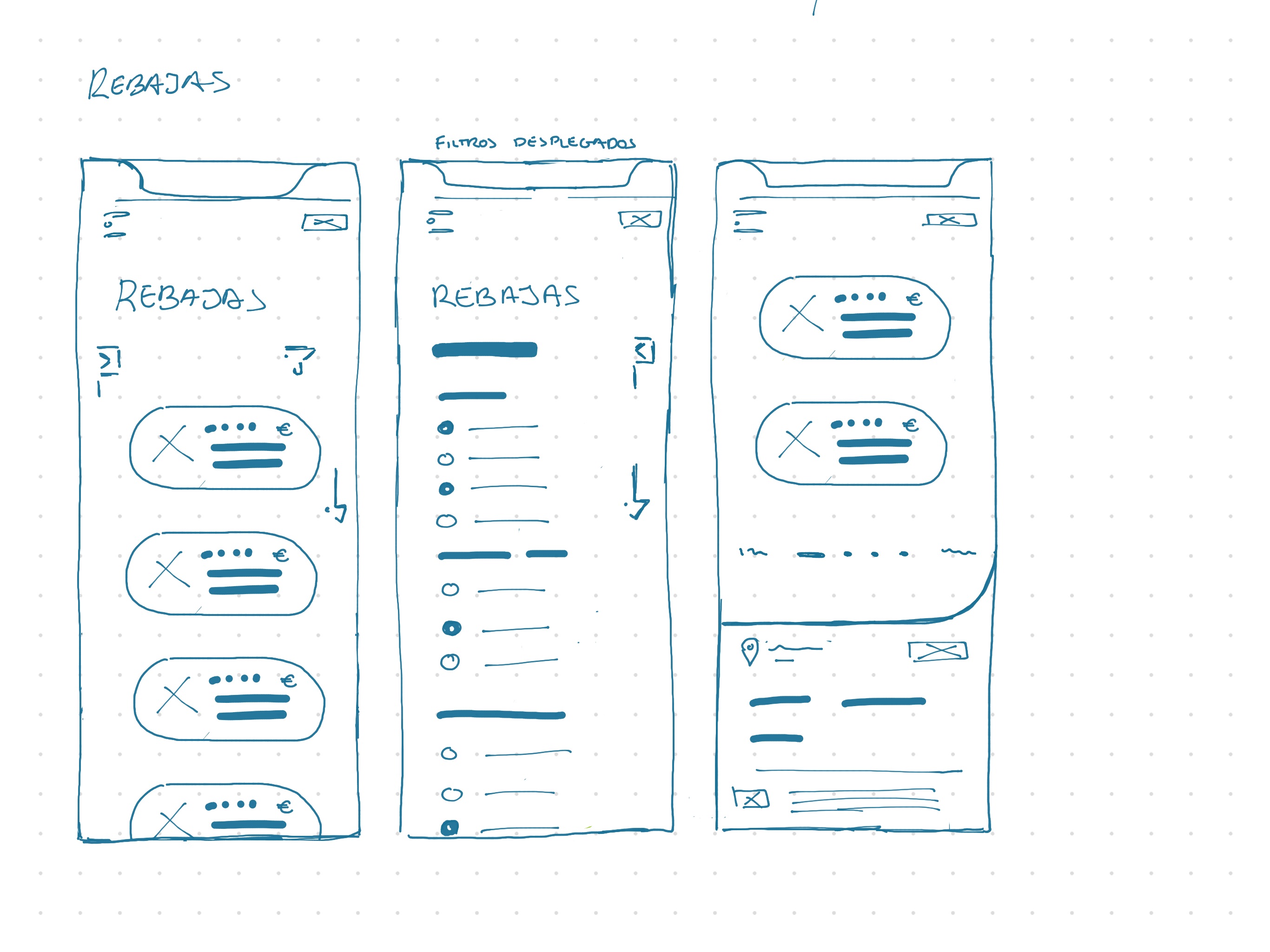 Las zonas de display de productos utilizan esferas, que se encuentran en una zona de scroll horizontal limitada. Esto es porque la homepage sirve como display publicitario, y se puede ampliar la cantidad de productos accediendo a la página correspondiente. El diseño de la página de Rebajas es un ejemplo de cómo se plantearían todas los apartados de productos, de forma modular, empleando las esferas. Mientras que en la versión móvil se utiliza la esfera desplegada con más información, en desktop aparece únicamente la esfera pequeña, con el precio, nombre del producto y una imagen. Al hacer hoover sobre él, se despliega el swatch medio con mayor información, y para consultar toda la información habría que hacer click y acceder a la página de info del producto.