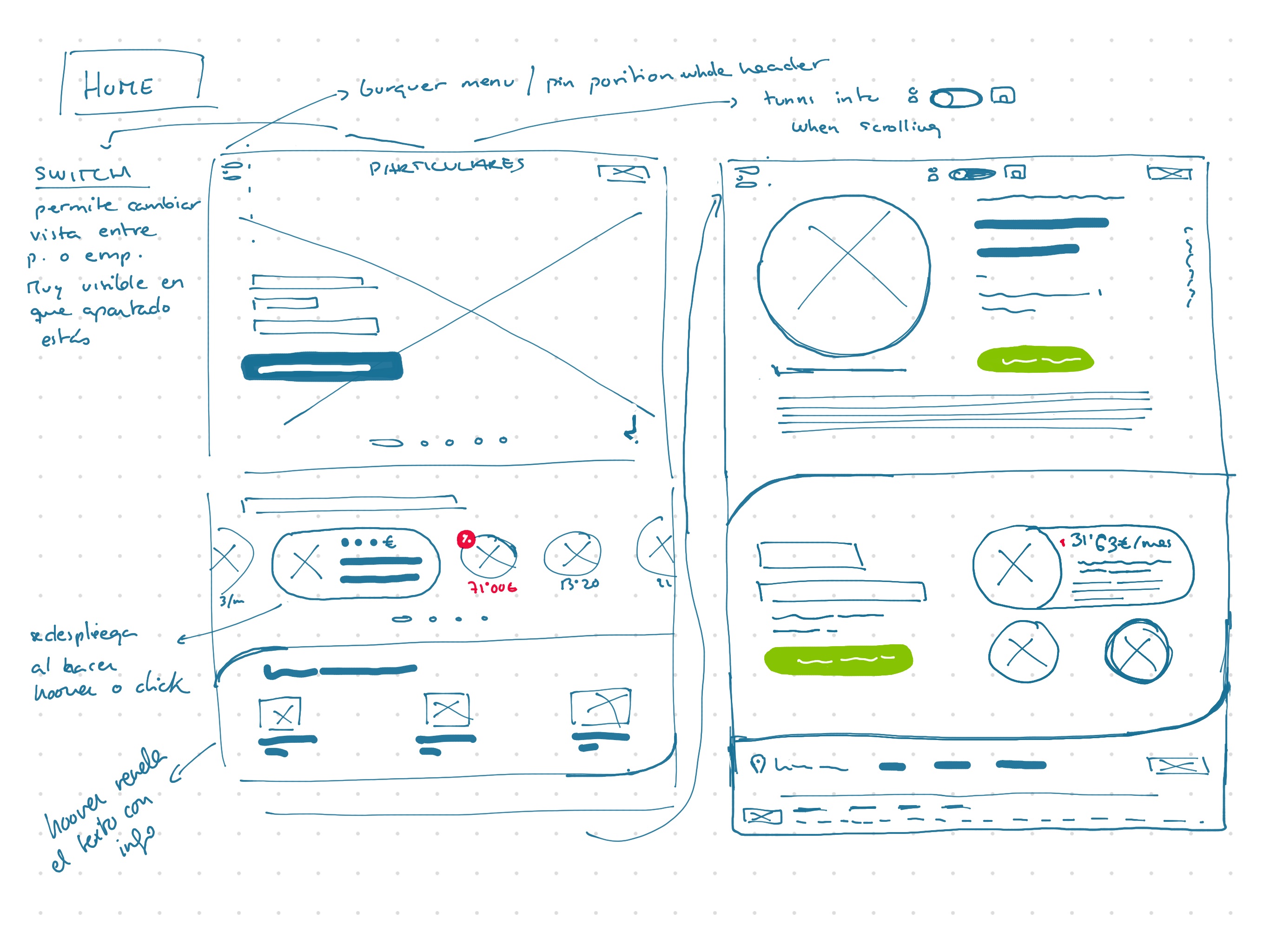 El menú de navegación tradicional, por ejemplo, desaparece y se convierte en un menú burger, como podemos encontrar en la versión móvil. Esto facilita la limpieza visual del espacio en la web de desktop, y permite distribuir mucho mejor el contenido del menú, permitiendo además que si aparecieran más secciones, este se expanda verticalmente mediante un scroll, y evitamos saturar la pantalla con información colocando una ventana flotante cortada sobre la página.